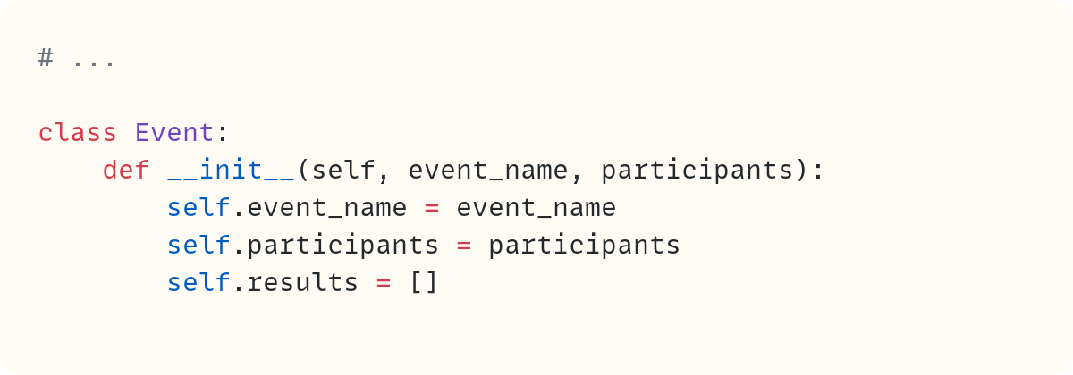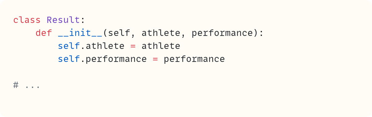 .event_nameis a string with the name of the event. You could use other data types, such as anEnum, but I’ll keep this simple here and use a string..participantsis a list containingAthleteinstances. These are the athletes participating in this particular event at the track and field meeting..resultscontains each athlete’s performance. We have choices. The simplest option is to use a list of tuples, where each tuple contains the athlete and the performance. However, since we’re working in the object-oriented domain, perhaps we could create aResultclass, and.resultsbecomes a list ofResultinstances.
