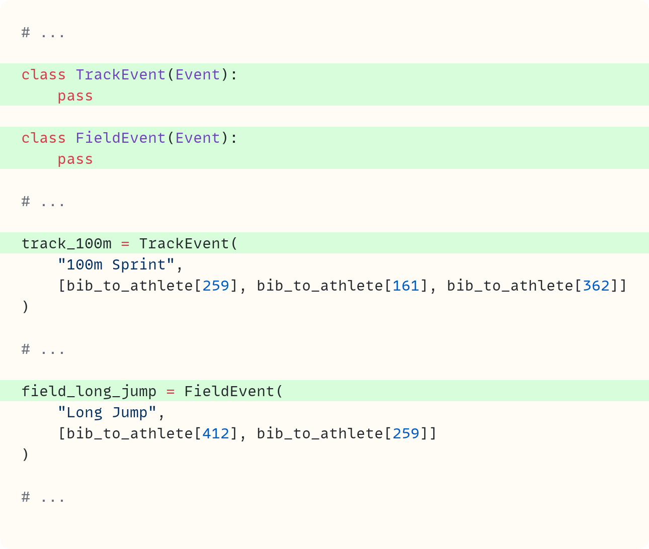 Note that you now use TrackEvent and FieldEvent to create instances for the 100m race and the long jump.