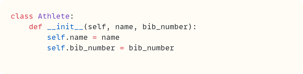 A good starting point is to define two classes, Athlete and Event. I’ll focus on the Event class in this post, so I’ll keep the Athlete class fairly basic: