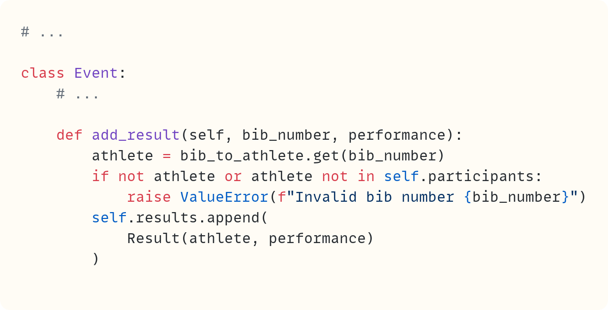 We’ll show an example of Event and Result instances soon. But first we need some methods. Let’s get back to the Event class and define .add_result(), which allows you to add a raw result in the format provided by the officials—the officials only provide the bib number and the performance, such as the time clocked by the athlete: