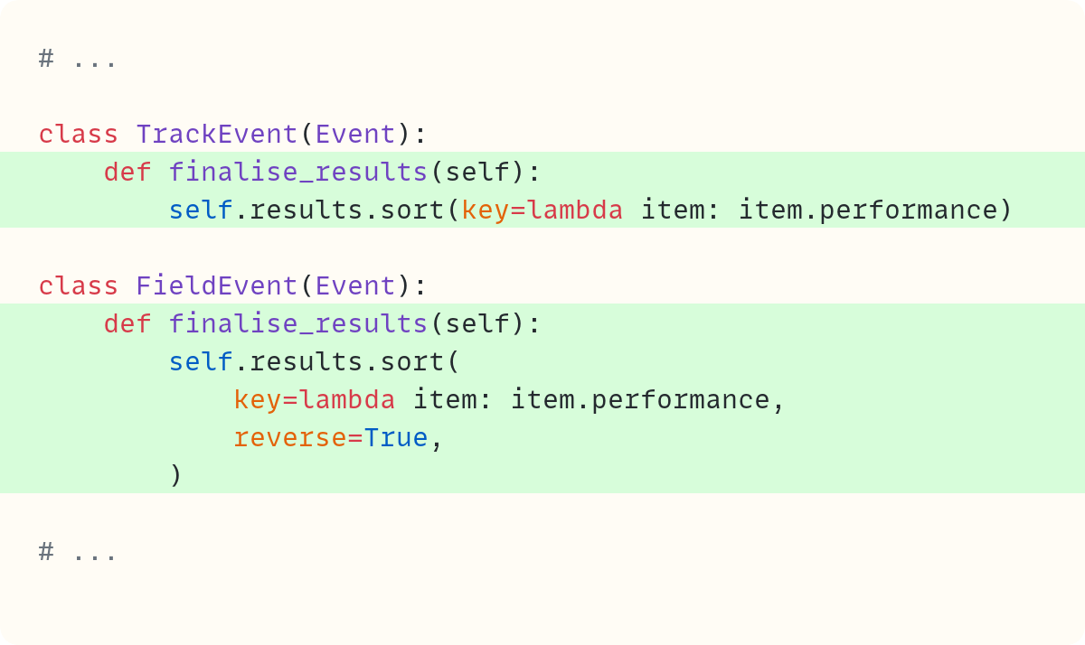 In TrackEvent, you include the same code you had in the original Event.finalise_results() since this algorithm works well for track events where the smallest numbers (the fastest times) represent the best performances.