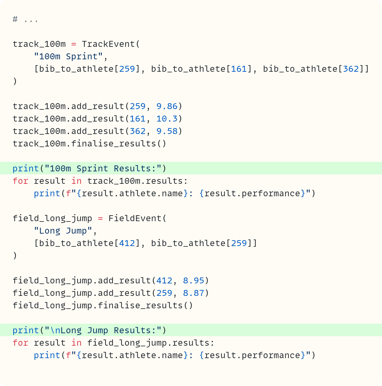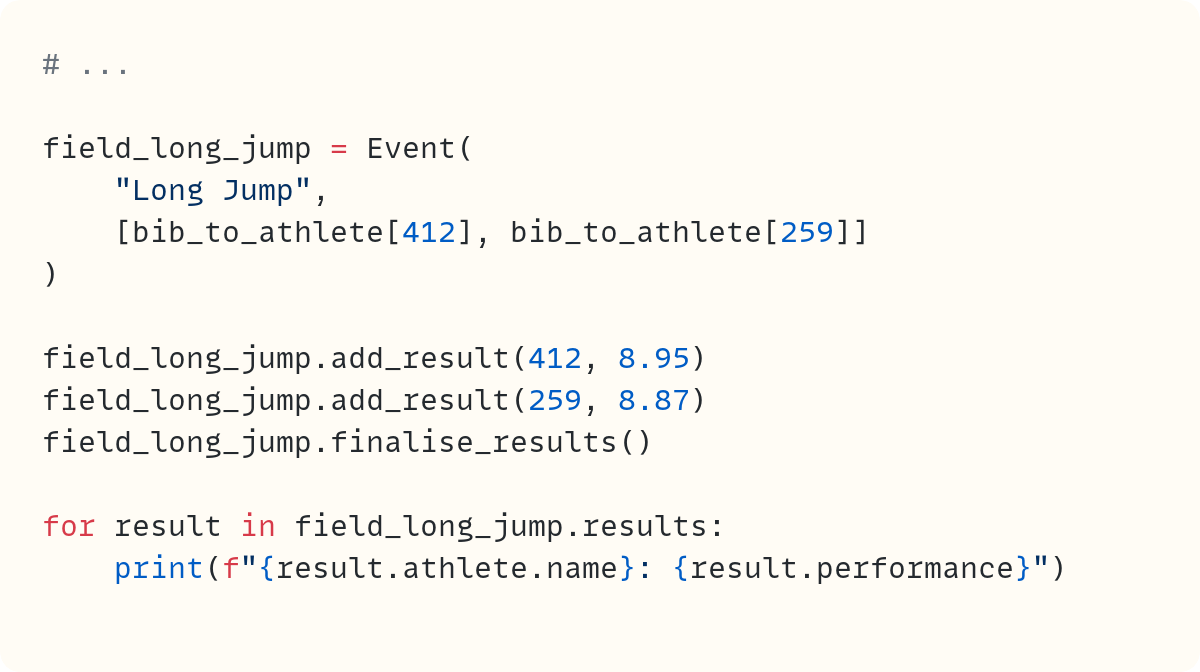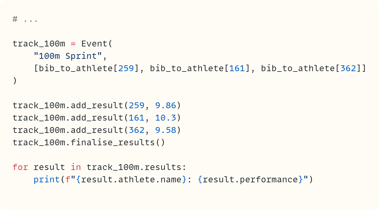 You create an Event instance for the 100m sprint race. Then you add three individual results. Finally, you finalise the results to get the athletes and their positions in the race.