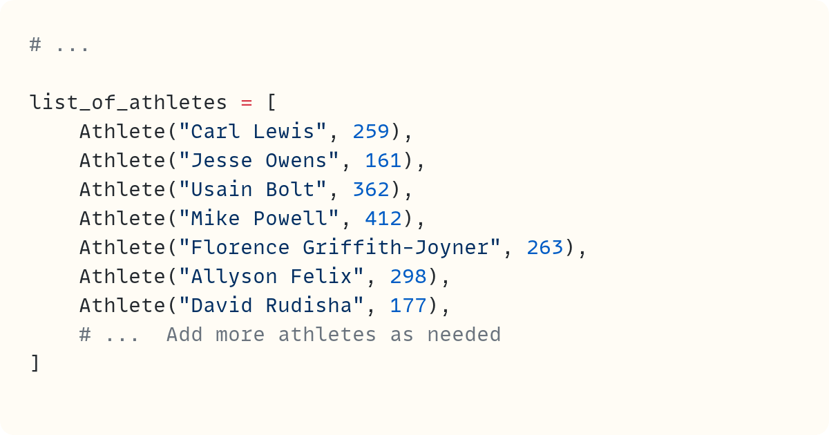 There’s more we could add to make this class more complete. But I won’t. You can create a list of athletes that are competing in the track and field meeting: