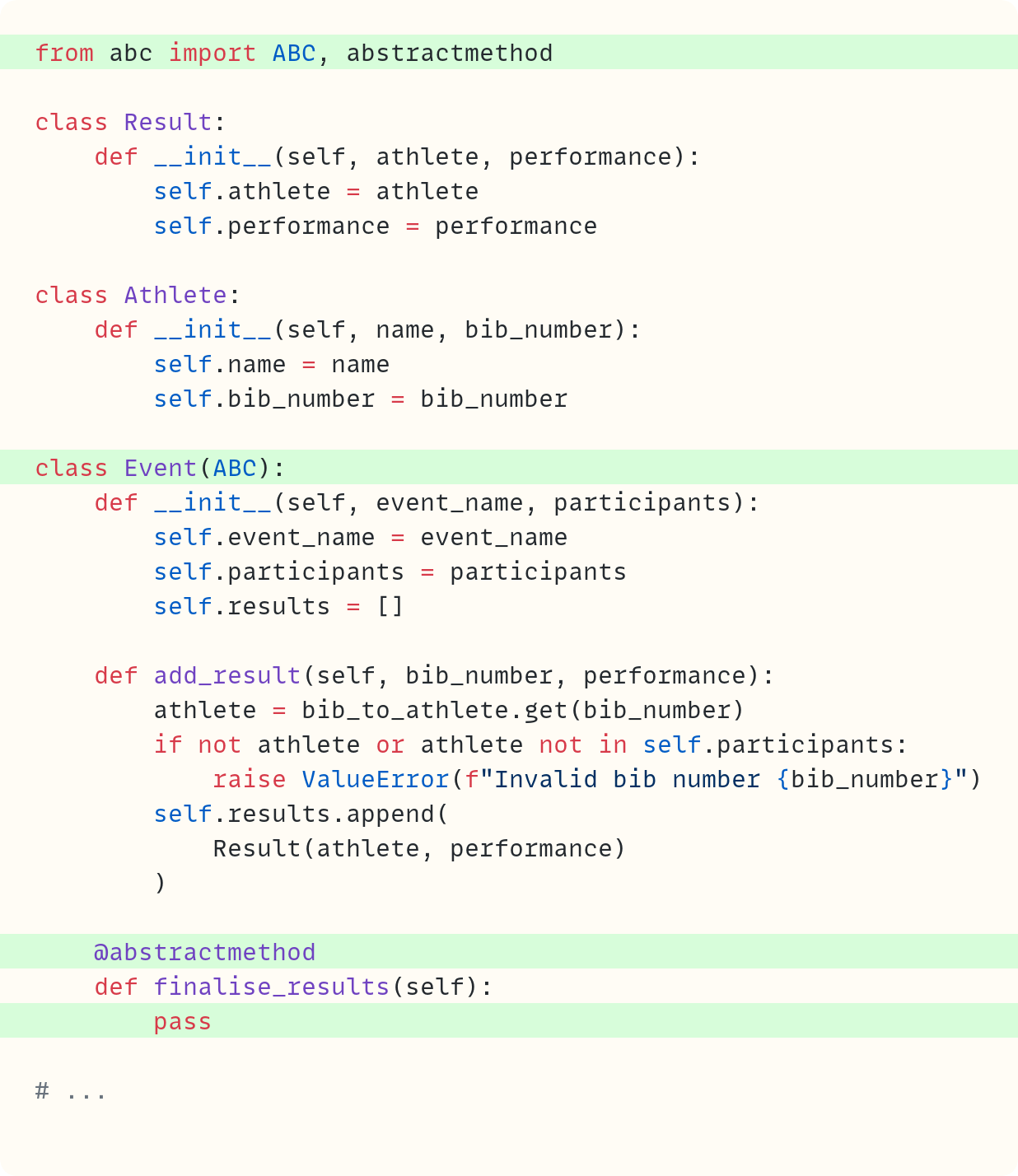 Here’s what you’re effectively stating when you create this ABC with the .finalise_results() abstract method: Any class derived from the Event ABC must include a .finalise_results() method.