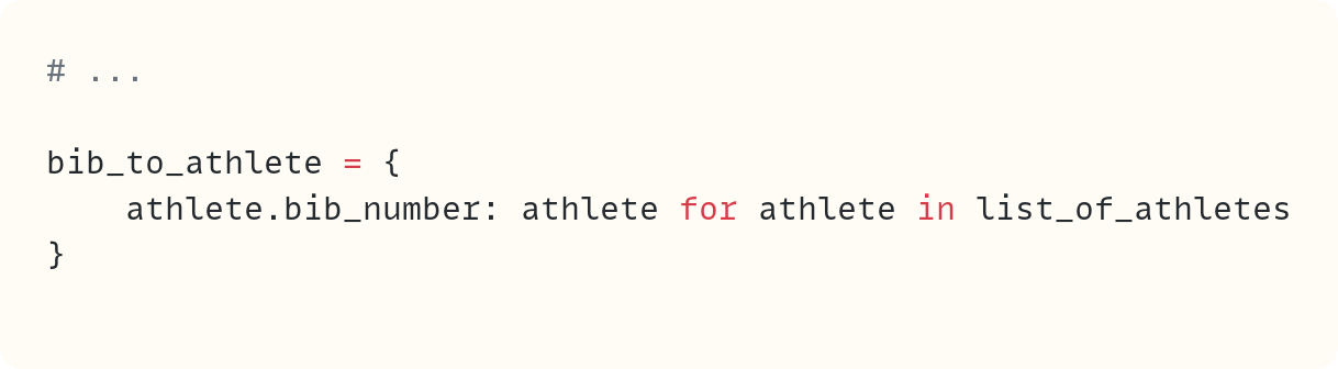 To make it easy and efficient to obtain the Athlete object just from a bib number, you can create a bib_to_athlete dictionary: