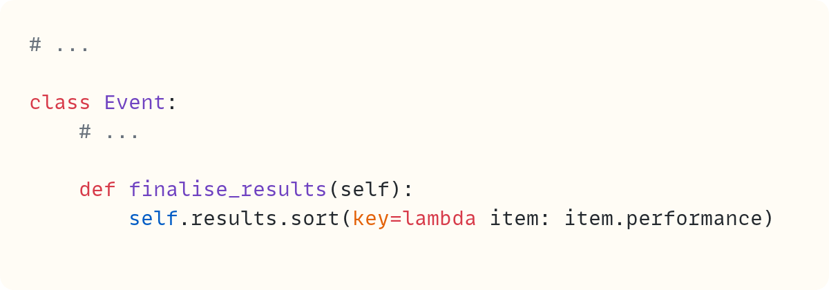 Since .finalise_results() sorts based on the performace, the athlete with the fastest time takes the first position in the list, and so on. Here’s the output from the for loop displaying the athletes in .results in order: