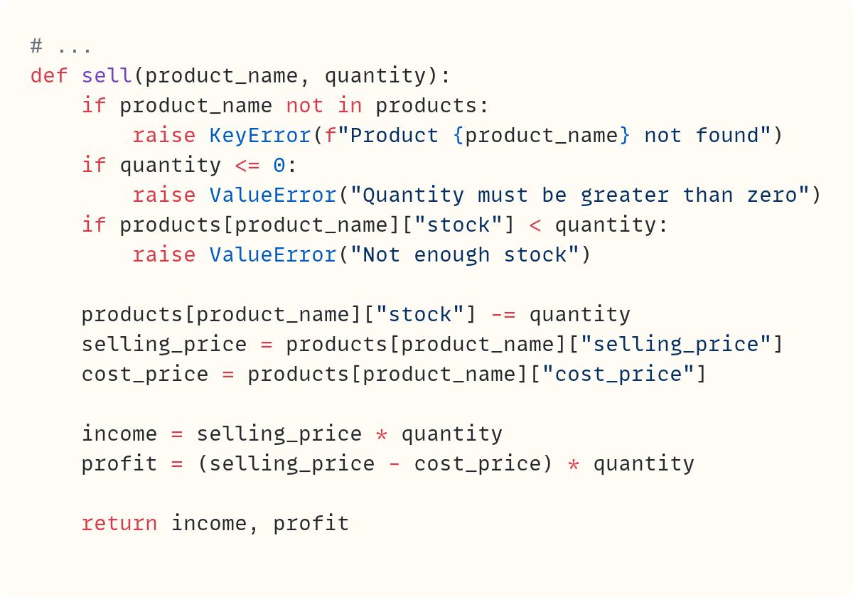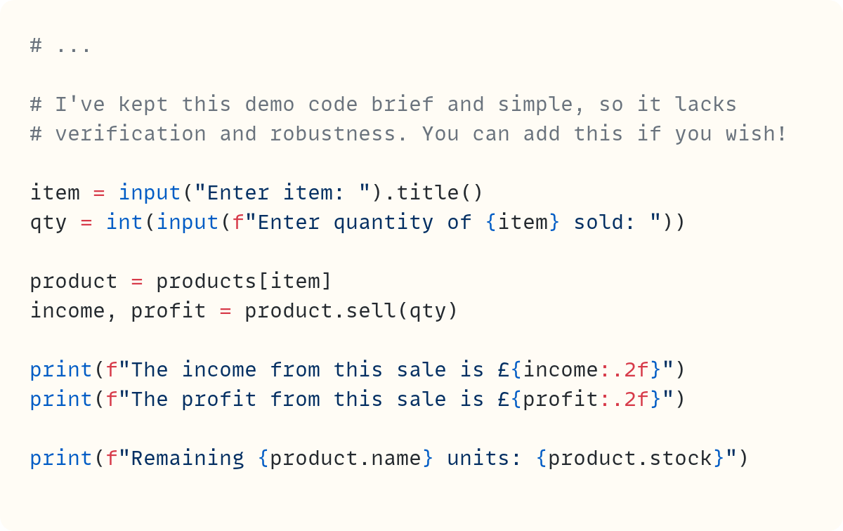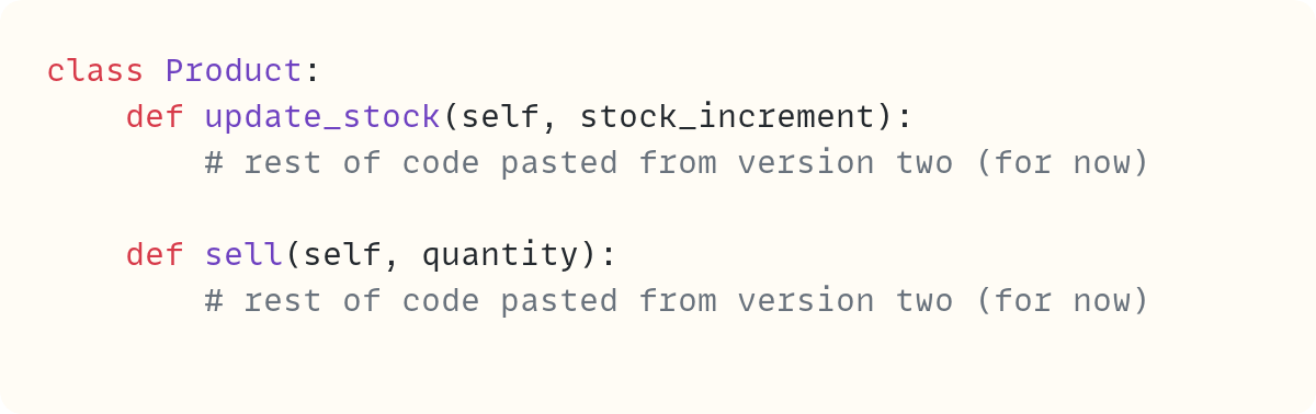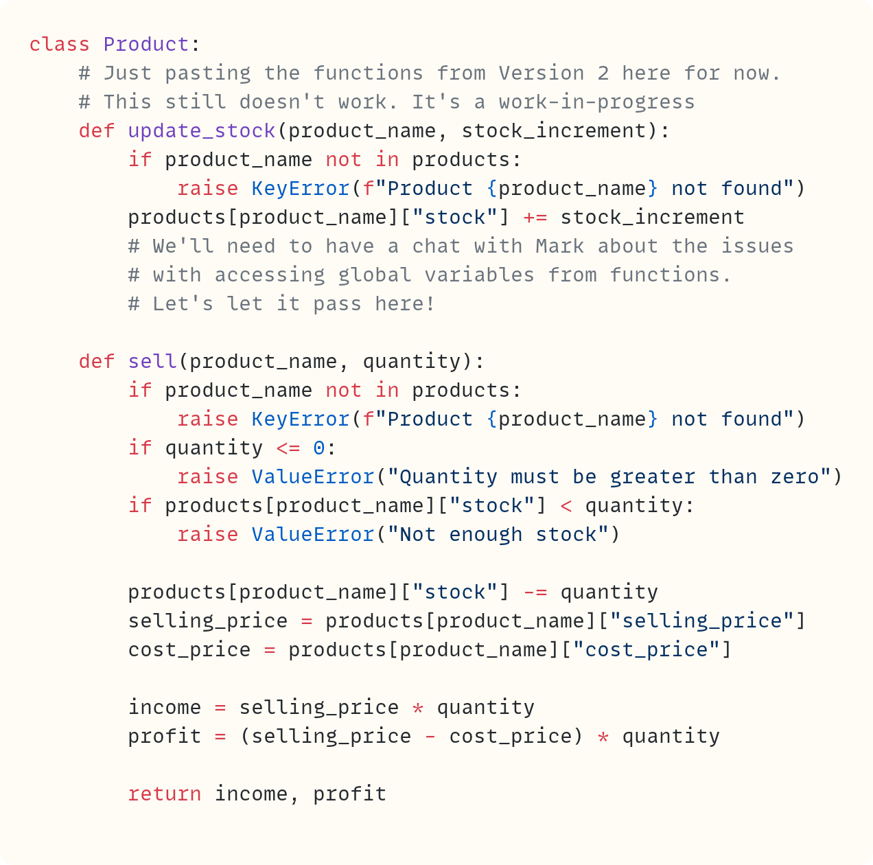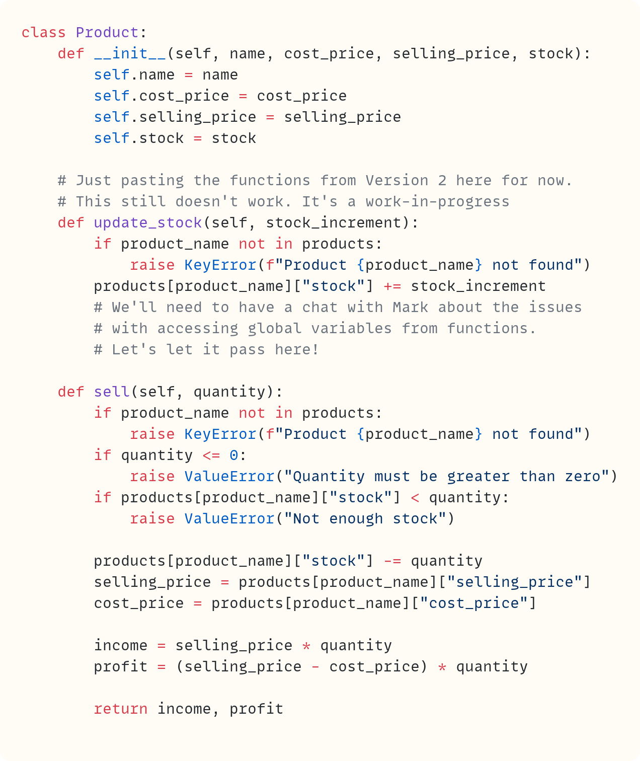 You’ve seen that each function in version two needed to know which product it was dealing with. That’s why the first parameter is product_name. You used product_name to fetch the correct values when you needed the selling price, the cost price, or the number of items in stock.