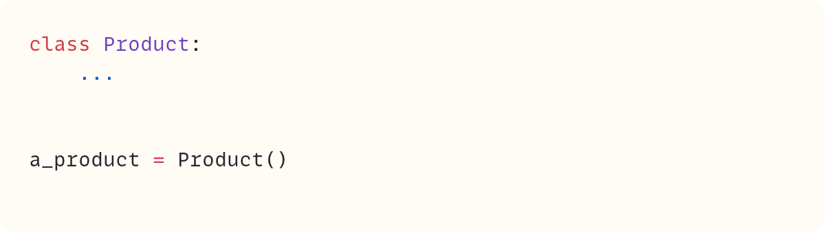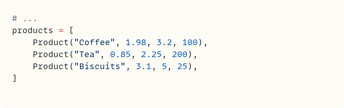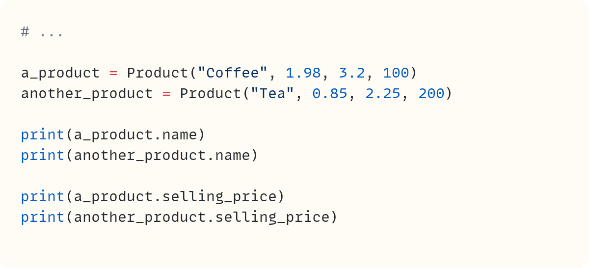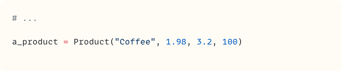 a_product = Product(”Coffee”, 1.98, 3.2, 100)