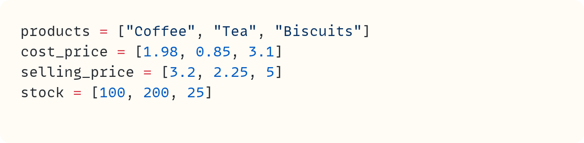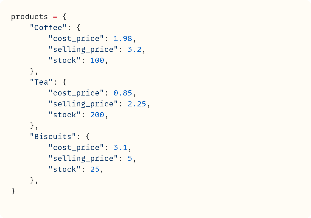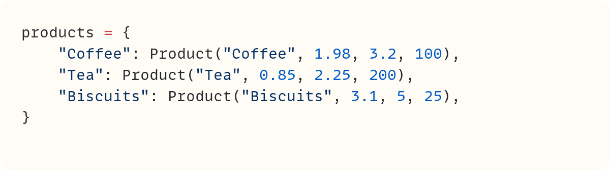 Mark is a Python beginner, but even he knew this was not the best way to store the relevant data for each product he sells.