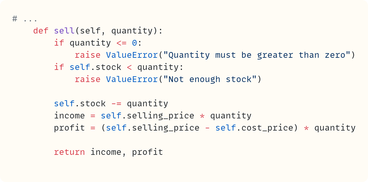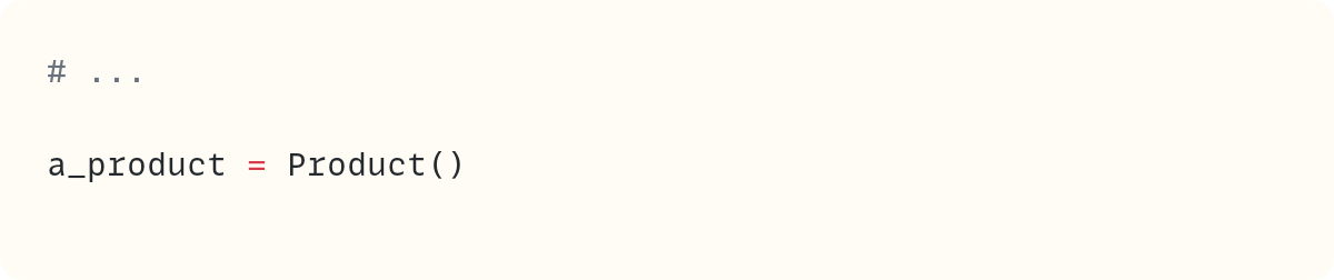 But this means that this method can only act on an object that already exists, that already has the data attributes it needs. You no longer need to check whether the product exists. If you’re calling this method, you’re calling it on a product. Checks on existence will happen elsewhere in your code.