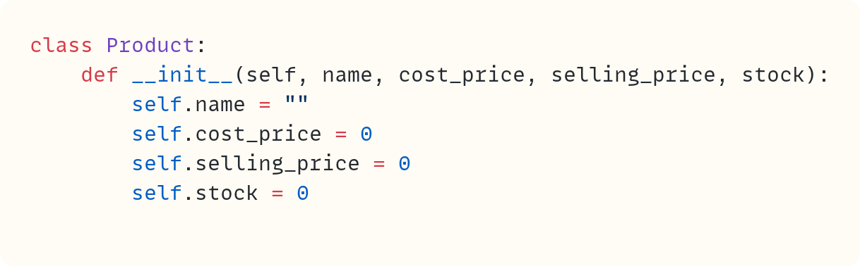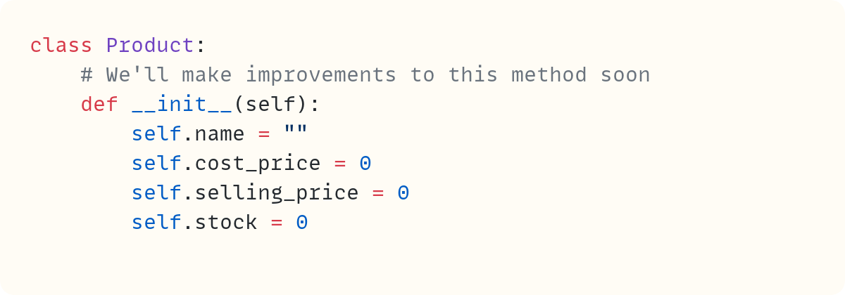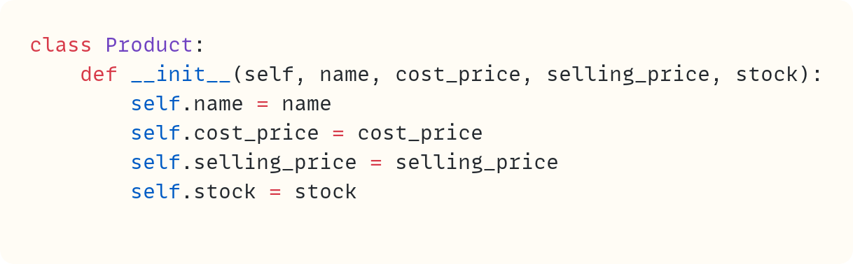 2.25Every instance of the Product class will have a .name, .cost_price, .selling_price, and .stock. But each instance will have its own values for those data attributes. Each object is distinct from the others. The data is self-contained within the object.