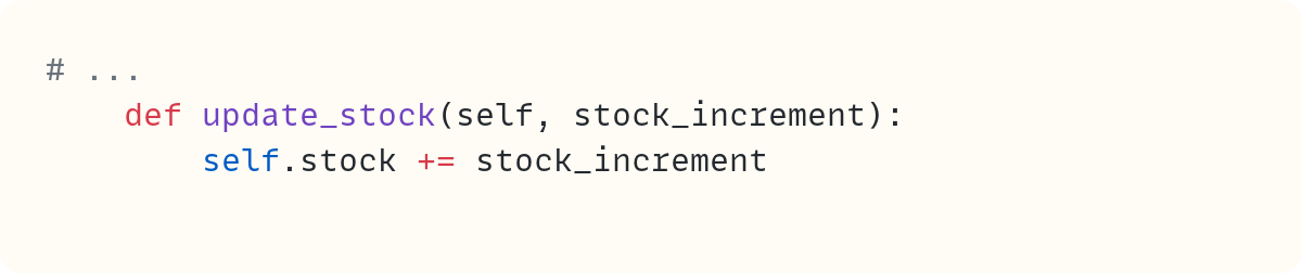 So, all that’s left is to increment the stock for this object. The current stock is stored in the .stock data attribute – the data attribute that’s connected to the object. But you passed the object to .update_stock(), so you can access self.stock from within the method: