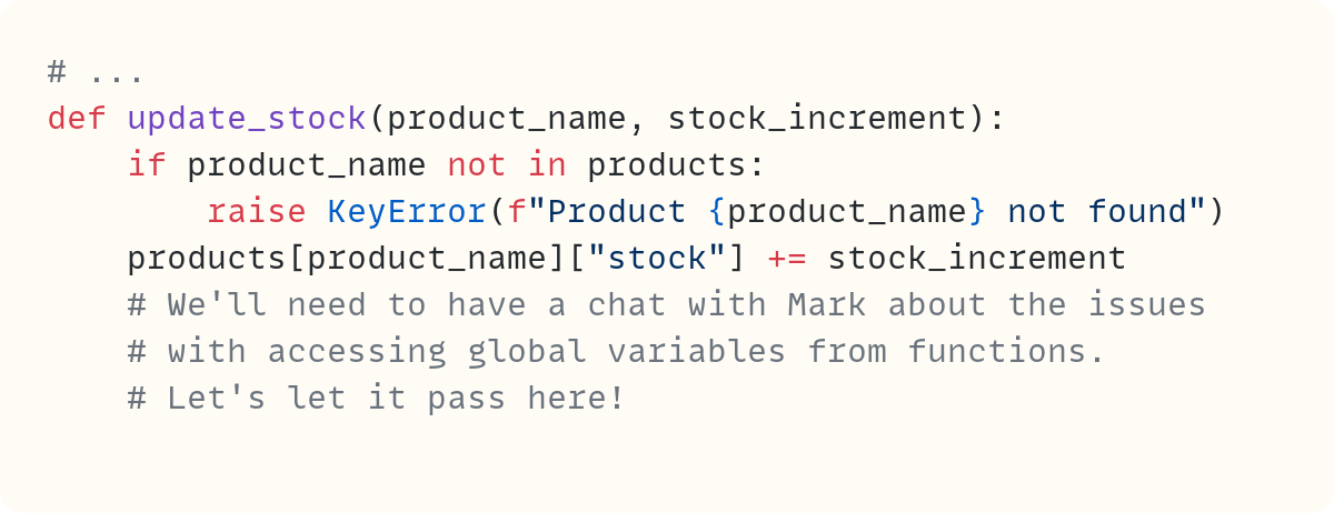 Let’s ignore the fact that Mark is accessing the global variable products within the function. We’ll have a chat with Mark about this.